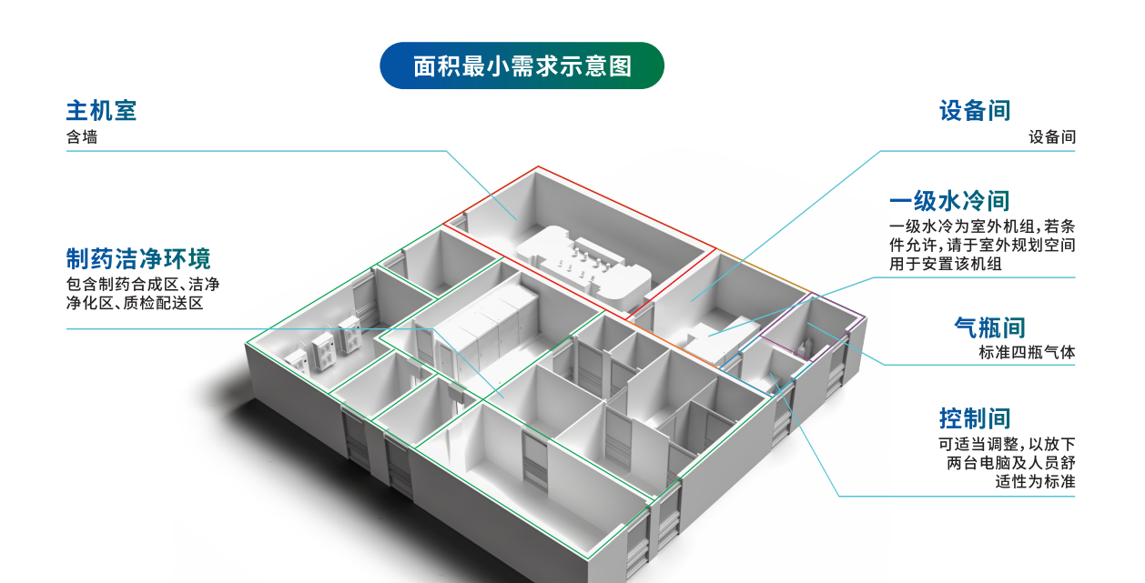 基本功能包含回旋加速器間、設(shè)備間、控制間、氣瓶間、制藥潔凈環(huán)境等。